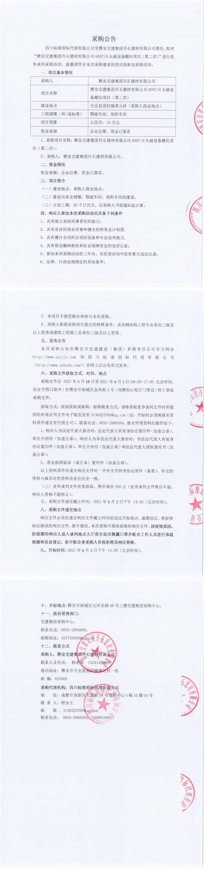 雅安交建集團丹石建材有限公司600T/H頭破設(shè)備棚化項目(第二次)競爭談判公告