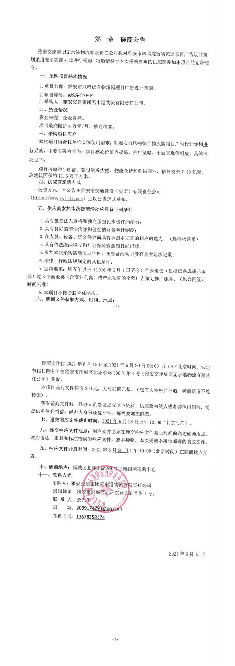 雅安交建集團(tuán)無(wú)水港物流有限責(zé)任公司雅安市鳳鳴綜合物流園項(xiàng)目廣告設(shè)計(jì)策劃磋商公告