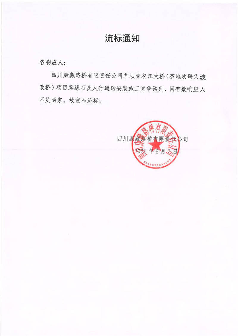 四川康藏路橋有限責(zé)任公司草壩青衣江大橋(茶地坎碼頭渡改橋)項(xiàng)目路緣石及人行道磚安裝施工競(jìng)爭談判流標(biāo)通知
