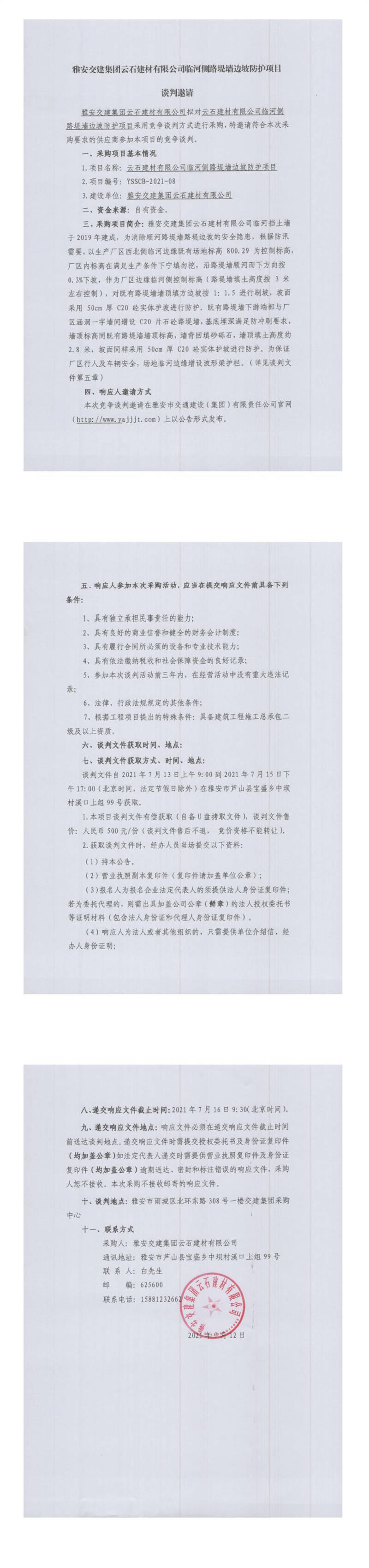 雅安交建集團云石建材有限公司臨河側路堤墻邊坡防護項目競爭談判公告