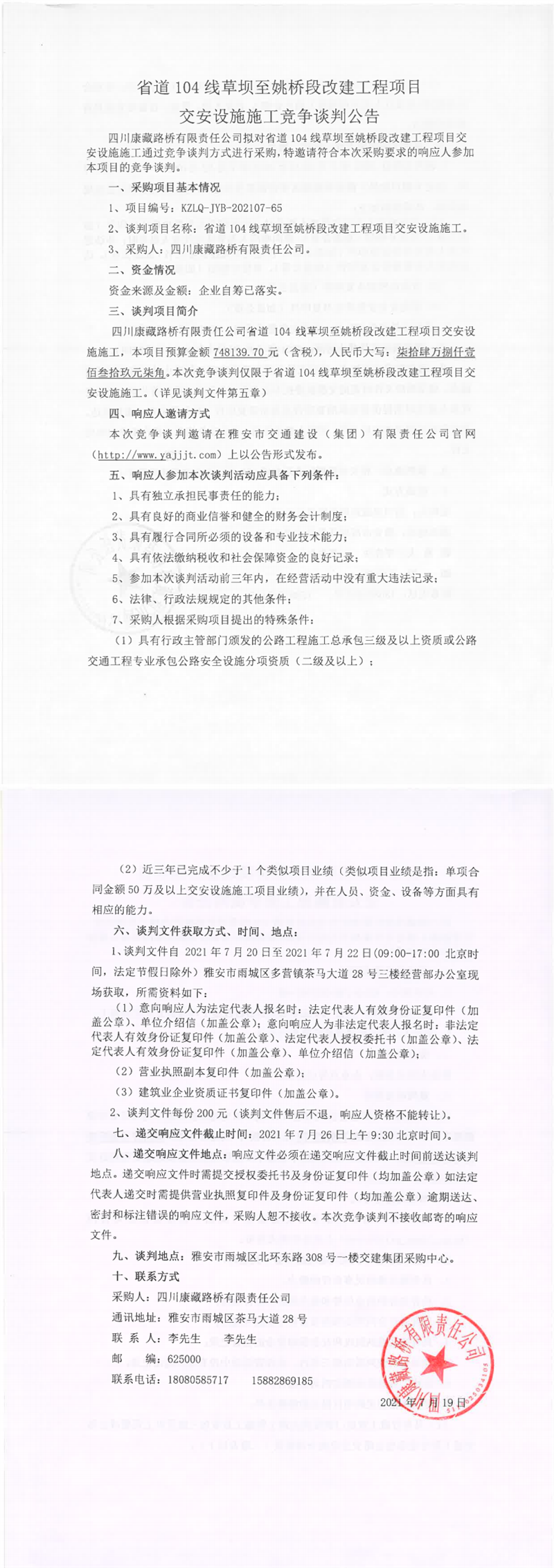 四川康藏路橋有限責(zé)任公司省道104線草壩至姚橋段改建項(xiàng)目交安設(shè)施施工競爭談判公告
