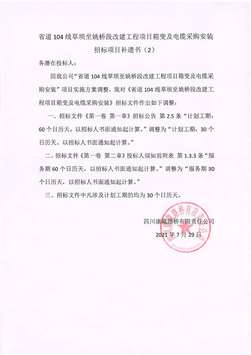 四川康藏路橋有限責(zé)任公司省道104線草壩至姚橋段改建項(xiàng)目箱變及電纜采購安裝招標(biāo)項(xiàng)目補(bǔ)遺書(2)