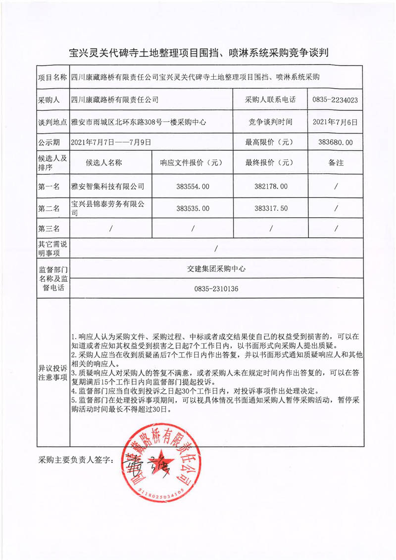 四川康藏路橋有限責(zé)任公司寶興靈關(guān)代碑寺土地整理工程項目圍擋、噴淋系統(tǒng)采購競爭談判結(jié)果公示