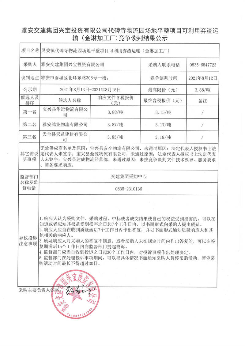 雅安交建集團(tuán)興寶投資有限公司代碑寺物流園場(chǎng)地平整項(xiàng)目可利用棄渣運(yùn)輸(金淋加工廠)競(jìng)爭(zhēng)談判結(jié)果公示