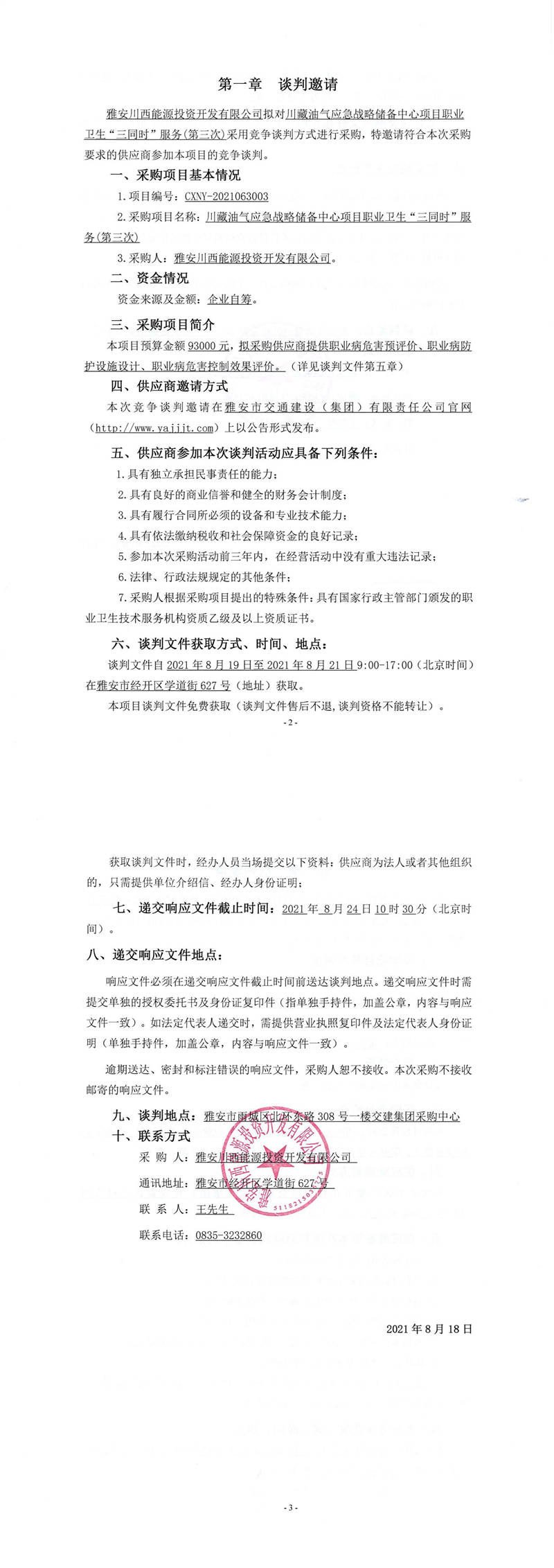 雅安川西能源投資開發(fā)有限公司川藏油氣應(yīng)急戰(zhàn)略儲備中心項(xiàng)目職業(yè)衛(wèi)生“三同時(shí)”服務(wù)(第三次)競爭談判