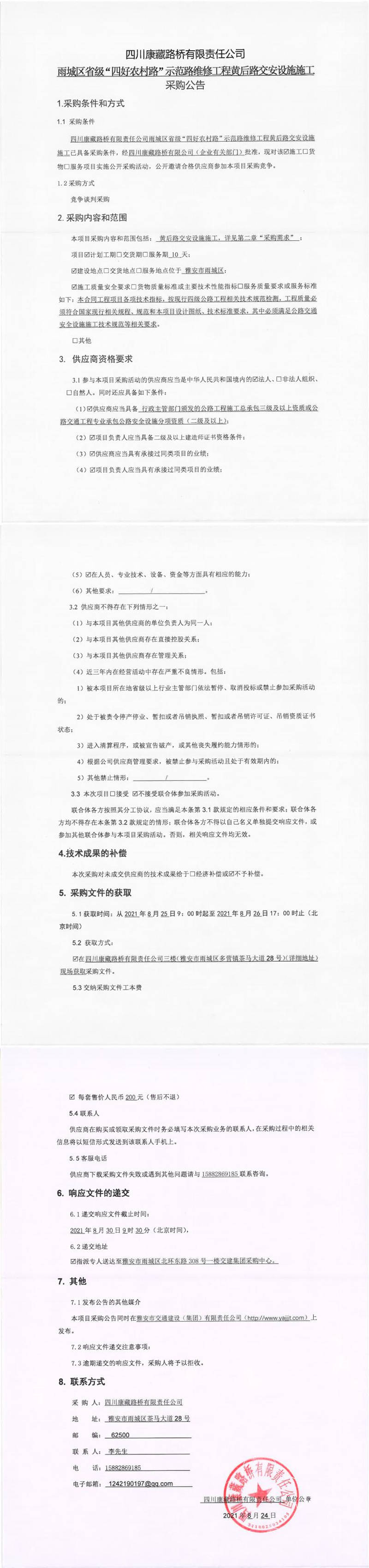 四川康藏路橋有限責任公司雨城區(qū)省級“四好農村路”示范路維修工程黃后路交安設施施工采購公告