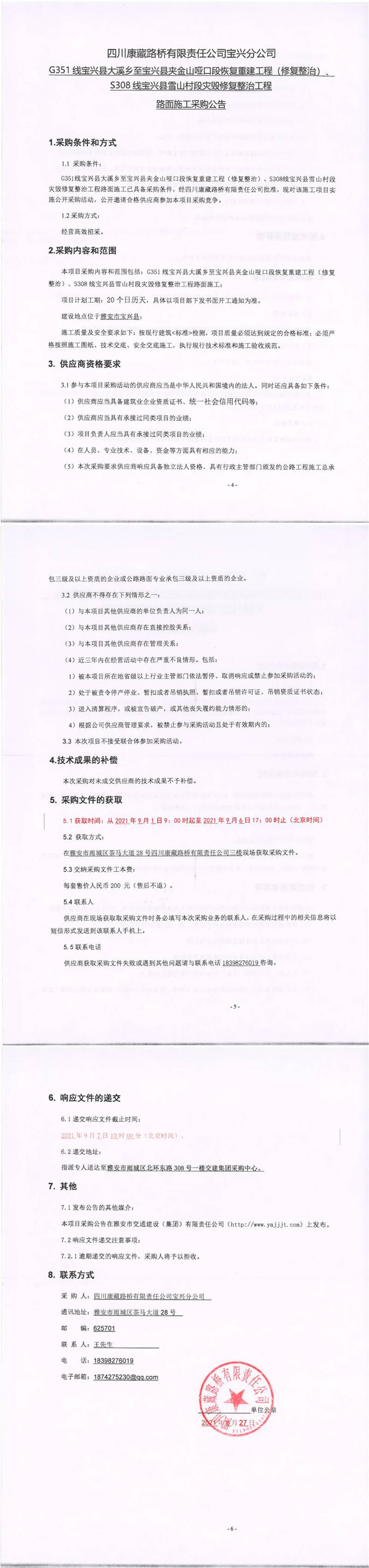 四川康藏路橋有限責(zé)任公司寶興分公司G351線寶興縣大溪鄉(xiāng)至寶興縣夾金山啞口段恢復(fù)重建工程(修復(fù)整治)、S308線寶興縣雪山村段災(zāi)毀修復(fù)整治工程路面施工采購(gòu)公告