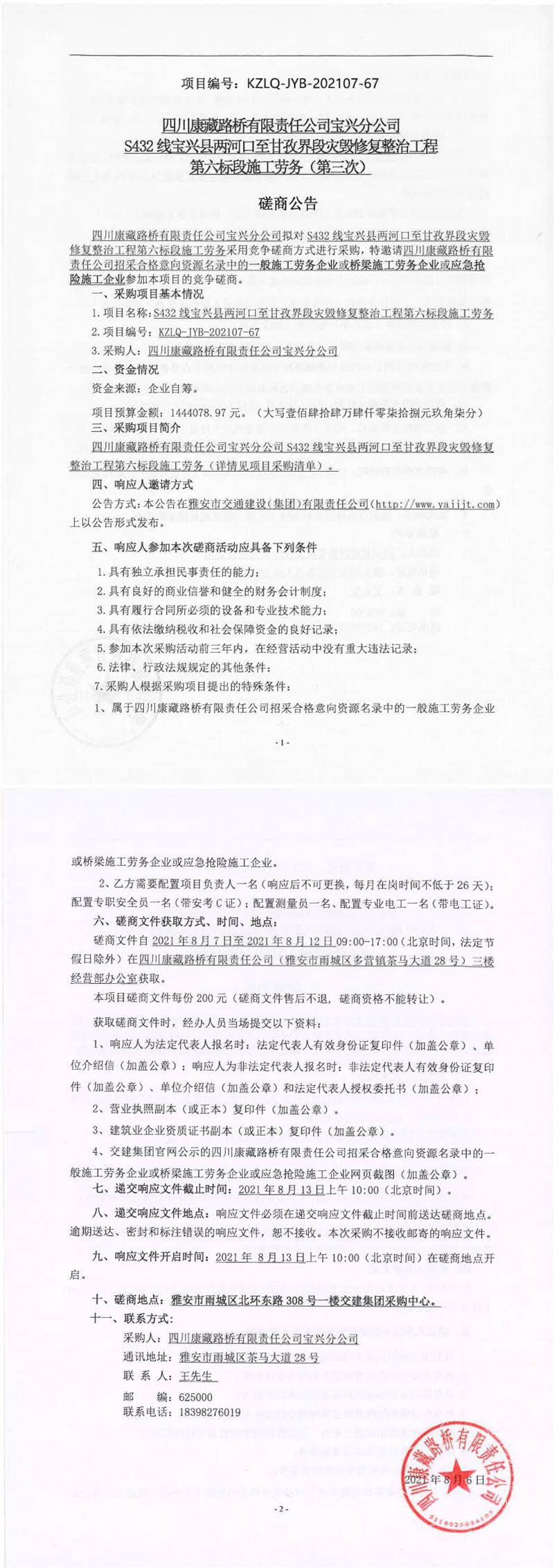 四川康藏路橋有限責任公司寶興分公司S432線寶興縣兩河口至甘孜界段災毀修復整治工程第六標段施工勞務(第三次)競爭磋商公告