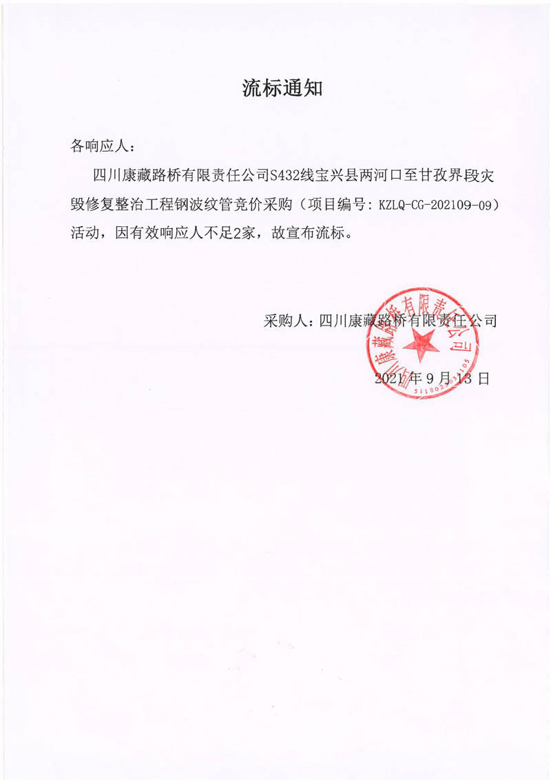 四川康藏路橋有限責(zé)任公司S432線寶興縣兩河口至甘孜界段災(zāi)毀修復(fù)整治工程鋼波紋管競(jìng)價(jià)采購(gòu)流標(biāo)通知