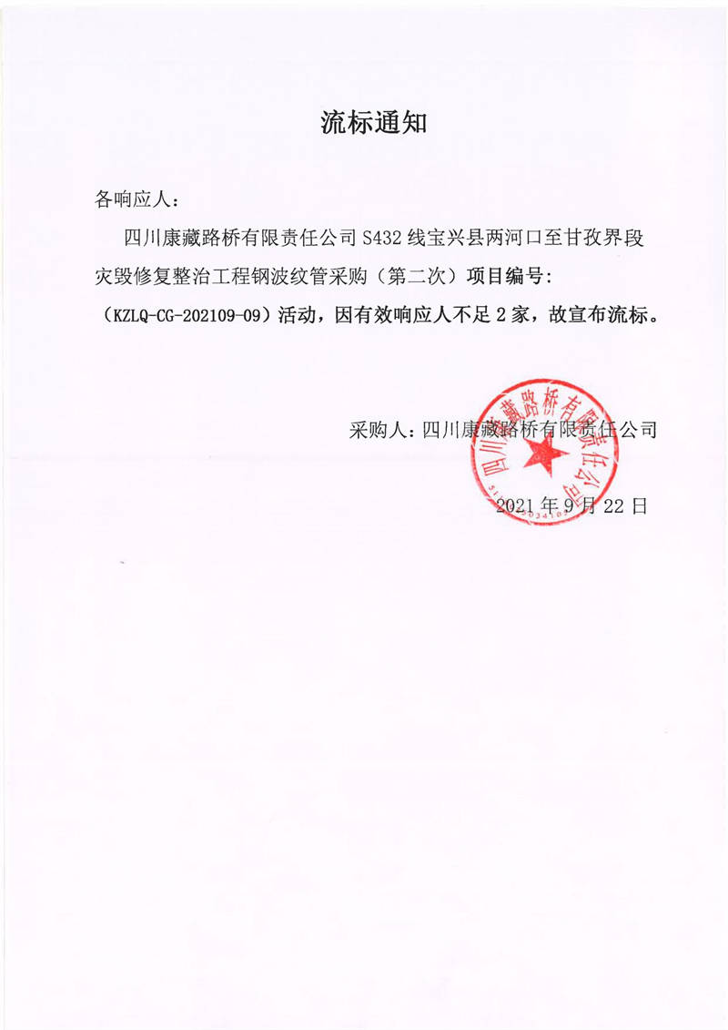四川康藏路橋有限責任公司S432線寶興縣兩河口至甘孜界段災毀修復整治工程鋼波紋管采購(第二次)流標通知