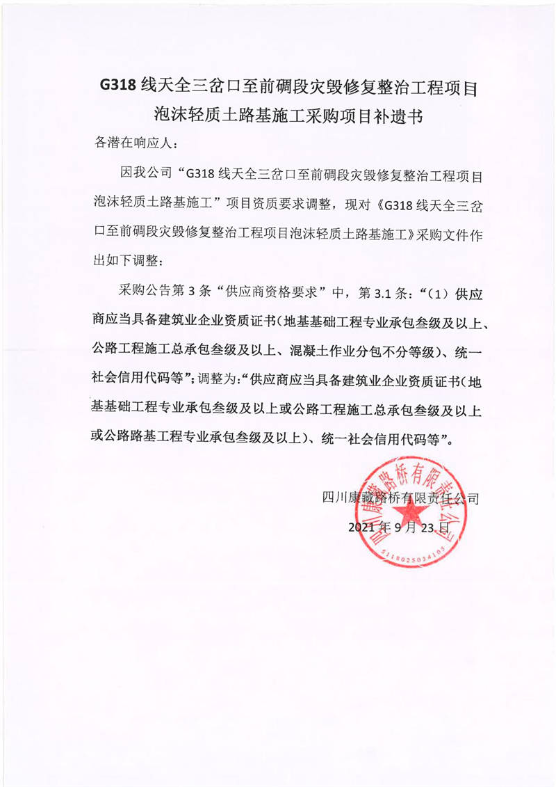 四川康藏路橋有限責(zé)任公司G318線天全三岔口至前碉段災(zāi)毀修復(fù)整治工程項(xiàng)目泡沫輕質(zhì)土路基施工采購(gòu)項(xiàng)目補(bǔ)遺書(shū)