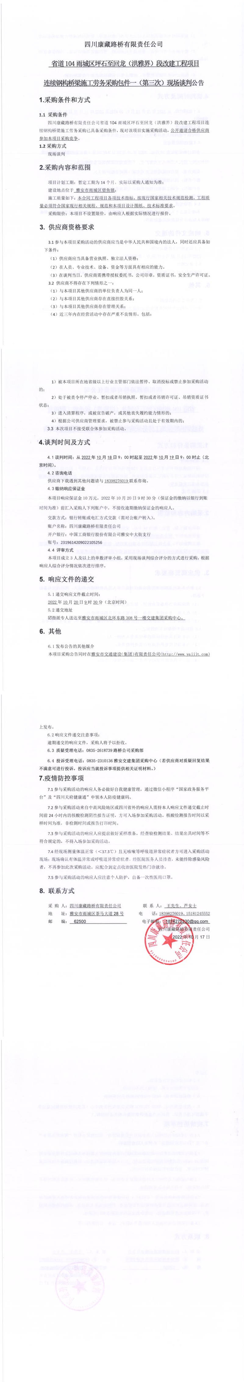 四川康藏路橋有限責任公司省道104雨城區(qū)坪石至回龍(洪雅界)段改建工程項目連續(xù)鋼構(gòu)橋梁施工勞務(wù)采購包件一(第三次)現(xiàn)場談判公告