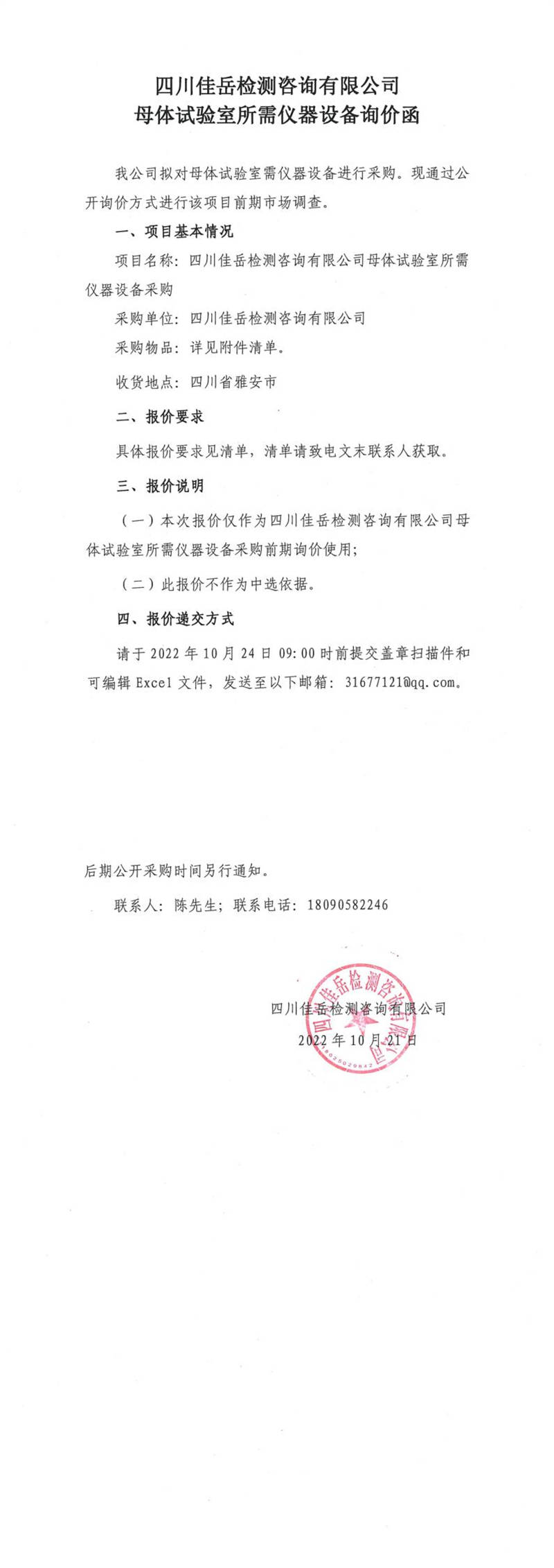 四川佳岳檢測咨詢有限公司母體試驗(yàn)室所需儀器設(shè)備詢價函