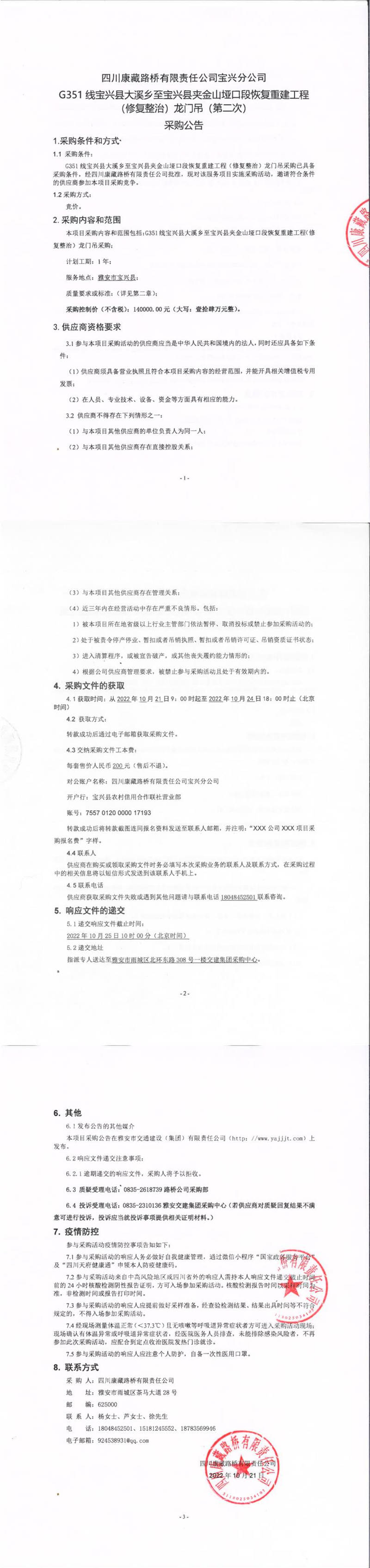 四川康藏路橋有限責(zé)任公司寶興分公司G351線寶興縣大溪鄉(xiāng)至寶興縣夾金山埡口段恢復(fù)重建工程(修復(fù)整治)龍門(mén)吊(第二次)采購(gòu)公告