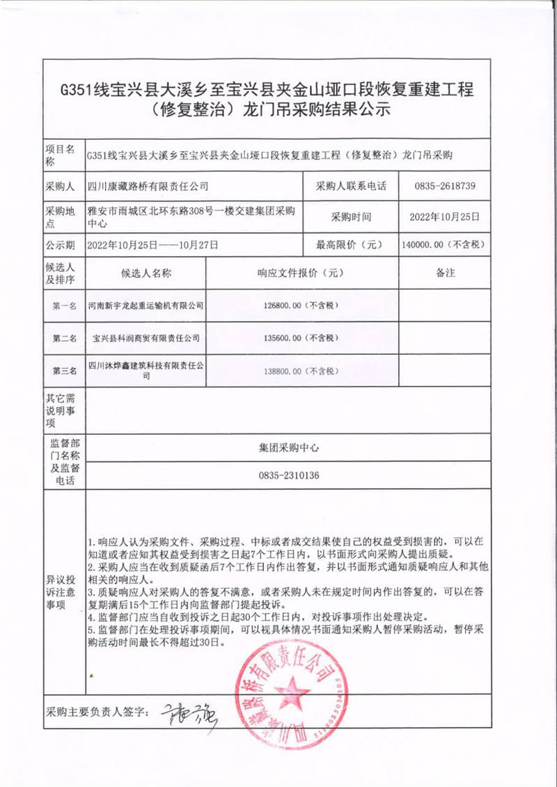 四川康藏路橋有限責任公司G351線寶興縣大溪鄉(xiāng)至寶興縣夾金山埡口段恢復(fù)重建工程(修復(fù)整治)龍門吊采購結(jié)果公示