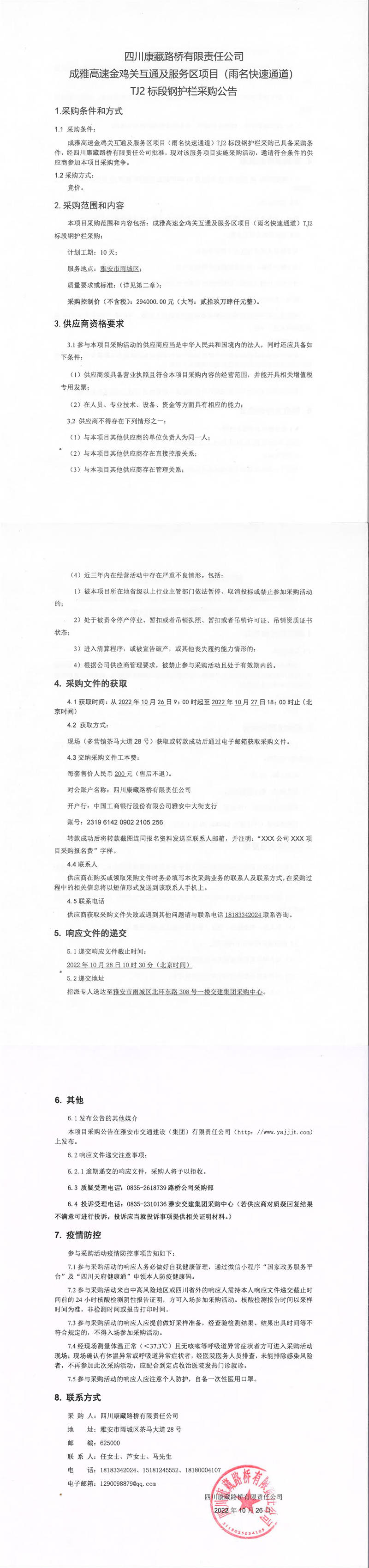 四川康藏路橋有限責(zé)任公司成雅高速金雞關(guān)互通及服務(wù)區(qū)項(xiàng)目(雨名快速通道)TJ2標(biāo)段鋼護(hù)欄采購公告