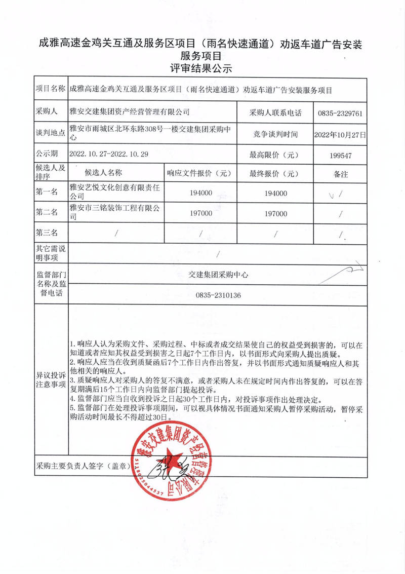 雅安交建集團資產(chǎn)經(jīng)營管理有限公司成雅高速金雞關(guān)互通及服務區(qū)項目(雨名快速通道)勸返車道廣告安裝服務項目評審結(jié)果公示
