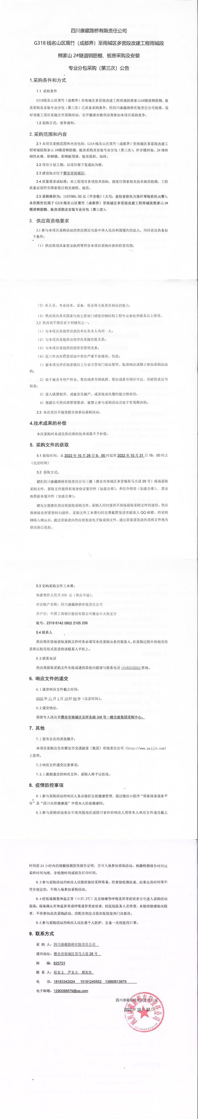 四川康藏路橋有限責任公司G318線名山區(qū)黑竹(成都界)至雨城區(qū)多營段改建工程雨城段熊家山2#隧道鋼筋棚、板房采購及安裝專業(yè)分包采購(第三次)公告