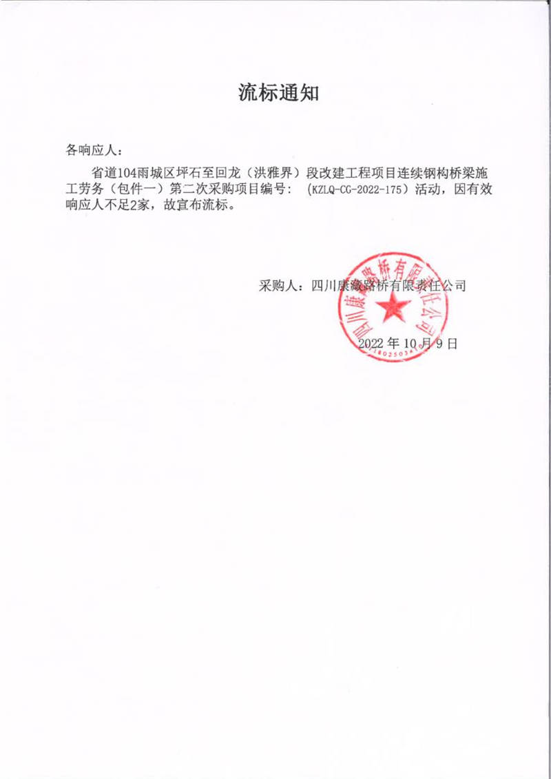 四川康藏路橋有限責任公司省道104雨城區(qū)坪石至回龍(洪雅界)段改建工程項目連續(xù)鋼構(gòu)橋梁施工勞務(wù)(包件一)第二次采購項目流標通知