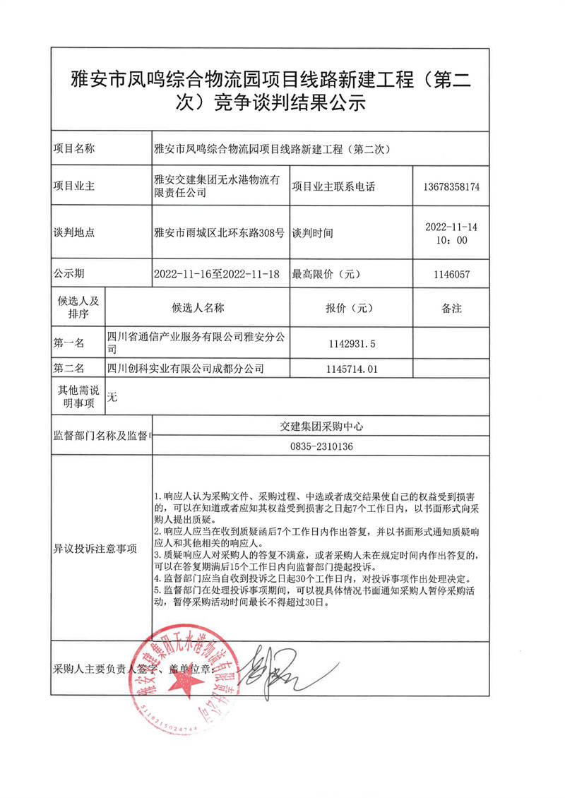 雅安交建集團(tuán)無水港物流有限責(zé)任公司雅安市鳳鳴綜合物流園項目線路新建工程(第二次)競爭談判結(jié)果公示