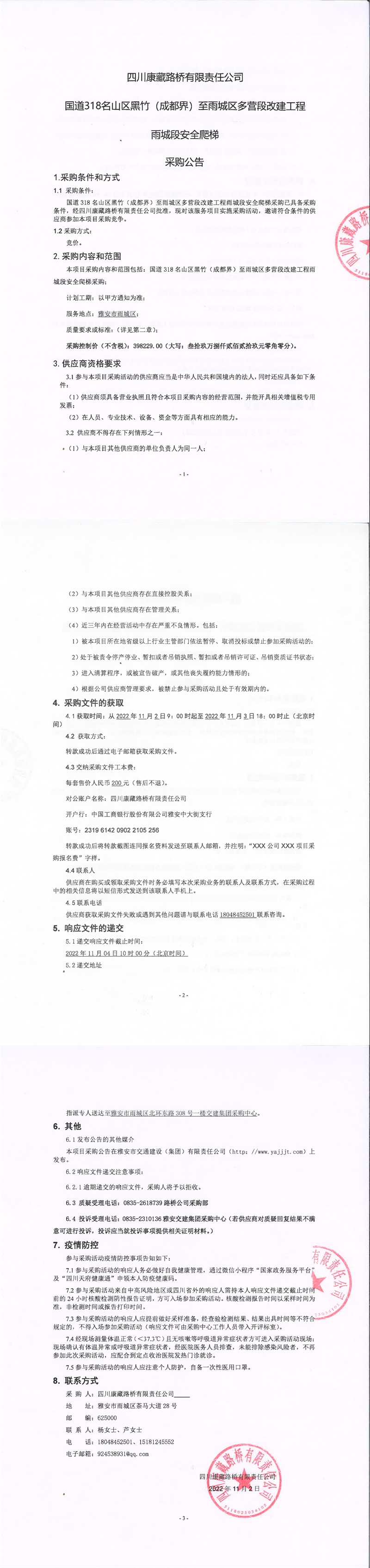 四川康藏路橋有限責(zé)任公司國(guó)道318名山區(qū)黑竹(成都界)至雨城區(qū)多營(yíng)段改建工程雨城段安全爬梯采購(gòu)公告