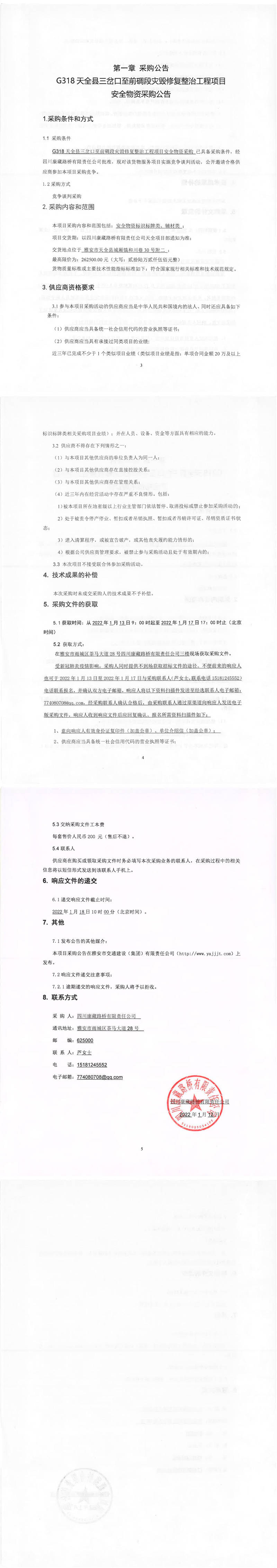 四川康藏路橋有限責(zé)任公司G318天全縣三岔口至前碉段災(zāi)毀修復(fù)整治工程項(xiàng)目安全物資采購公告