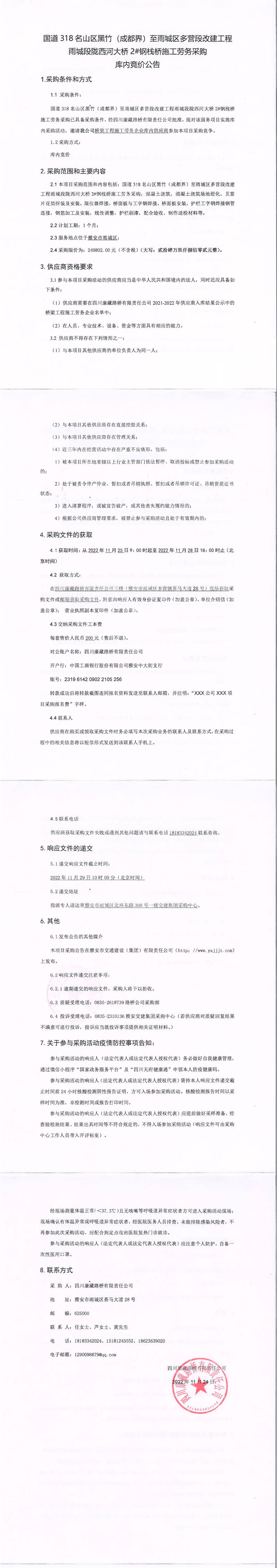 四川康藏路橋有限責任公司國道318名山區(qū)黑竹(成都界)至雨城區(qū)多營段改建工程雨城段隴西河大橋2#鋼棧橋施工勞務采購庫內競價公告