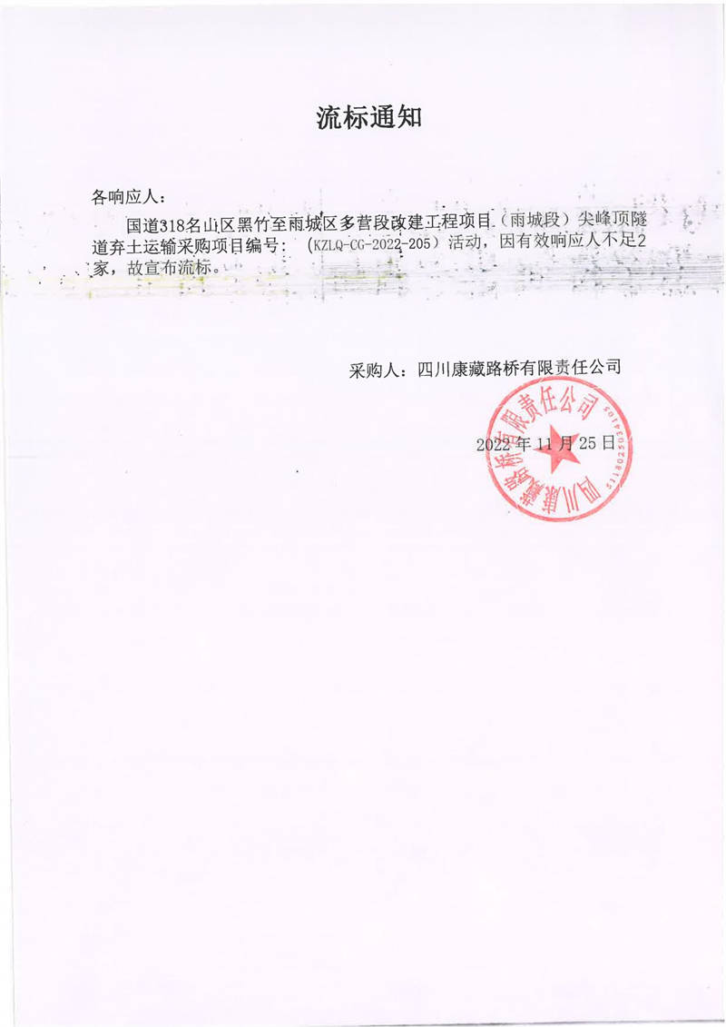 四川康藏路橋有限責(zé)任公司國道318名山區(qū)黑竹至雨城區(qū)多營段改建工程項目(雨城段)尖峰頂隧道棄土運(yùn)輸采購項目流標(biāo)通知
