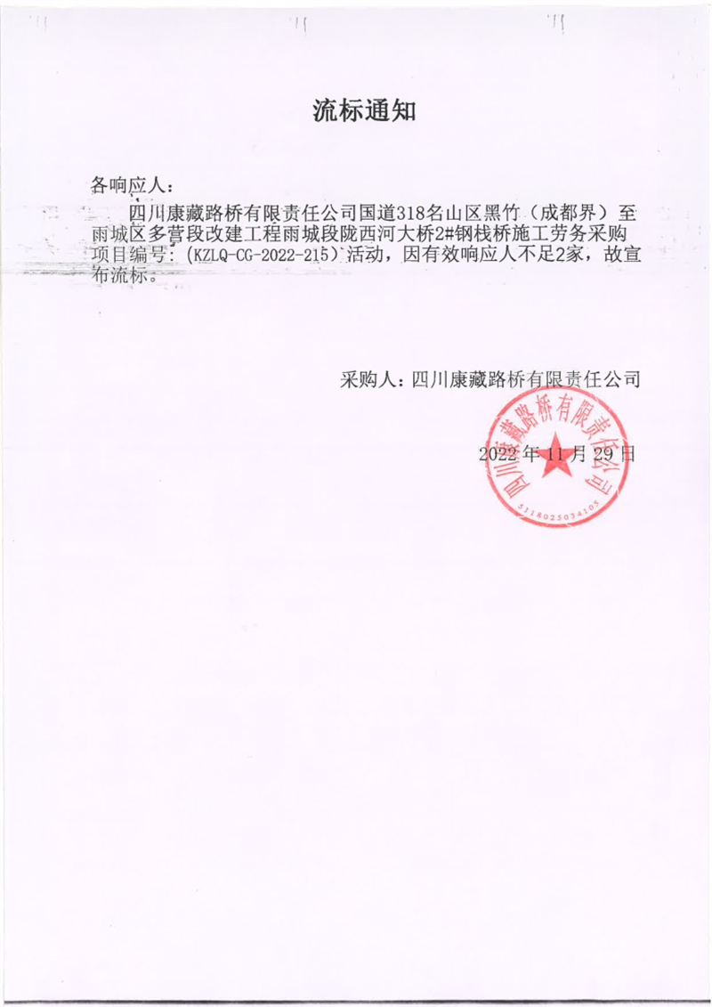 四川康藏路橋有限責(zé)任公司國(guó)道318名山區(qū)黑竹(成都界)至雨城區(qū)多營(yíng)段改建工程雨城段隴西河大橋2#鋼棧橋施工勞務(wù)采購(gòu)流標(biāo)通知