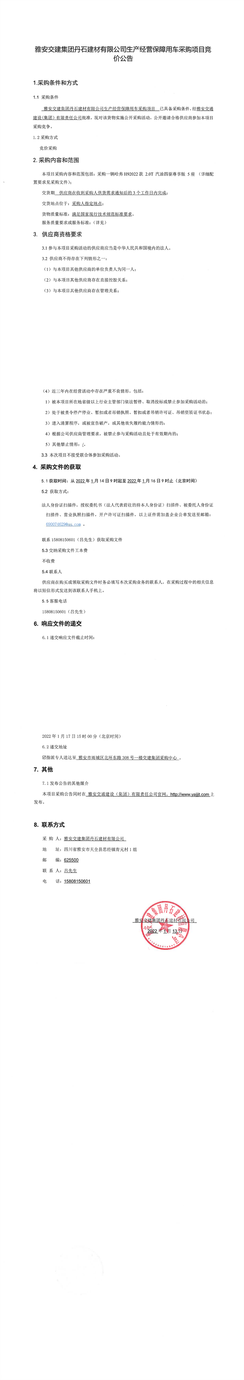 雅安交建集團(tuán)丹石建材有限公司生產(chǎn)經(jīng)營保障用車采購項目競價公告