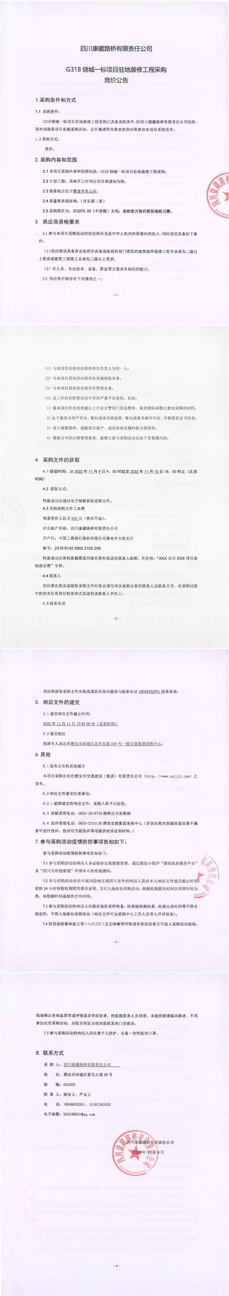 四川康藏路橋有限責(zé)任公司G318繞城一標(biāo)項(xiàng)目駐地裝修工程采購競價(jià)公告