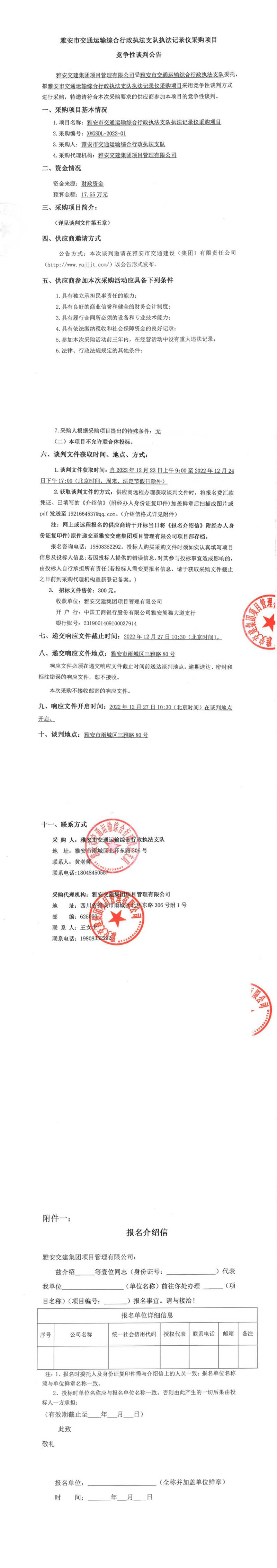 雅安交建集團(tuán)項(xiàng)目管理有限公司雅安市交通運(yùn)輸綜合行政執(zhí)法支隊(duì)執(zhí)法記錄儀采購項(xiàng)目競(jìng)爭(zhēng)性談判公告