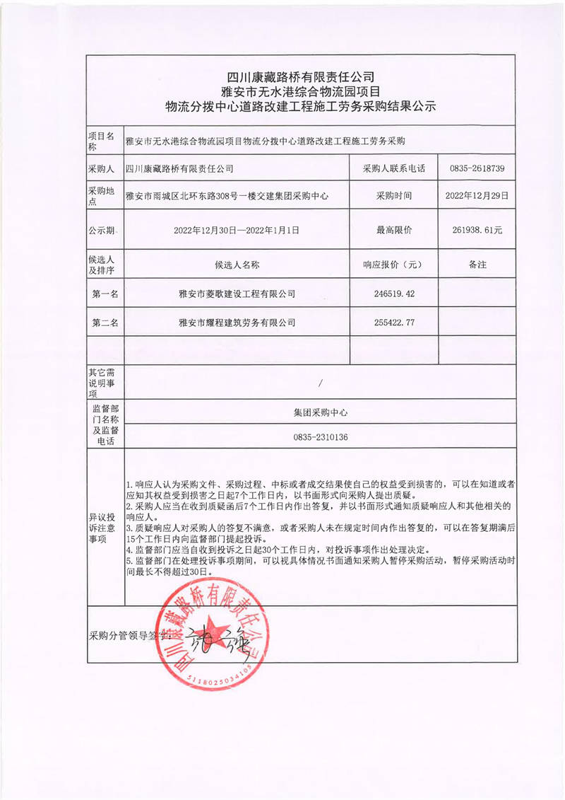 四川康藏路橋有限責(zé)任公司雅安市無(wú)水港綜合物流園項(xiàng)目物流分撥中心道路改建工程施工勞務(wù)采購(gòu)結(jié)果公示