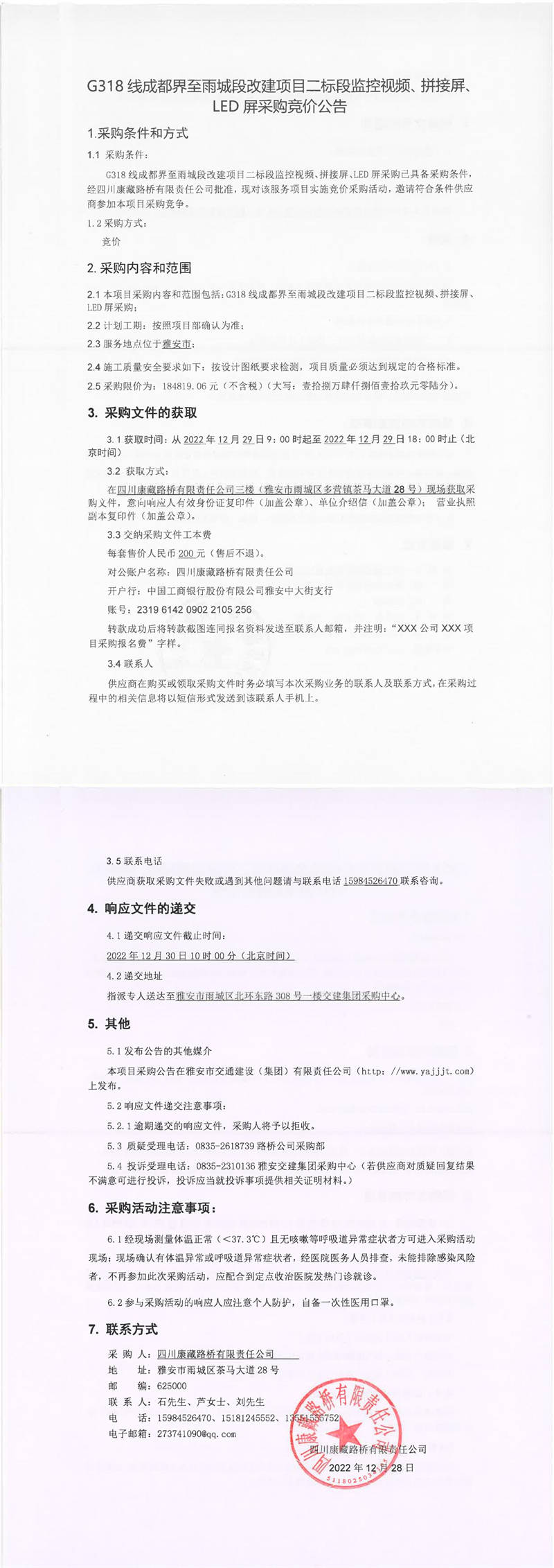 四川康藏路橋有限責(zé)任公司G318線成都界至雨城段改建項(xiàng)目二標(biāo)段監(jiān)控視頻、拼接屏、LED屏采購競(jìng)價(jià)公告