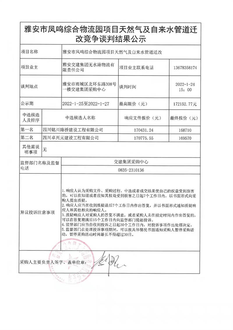 雅安交建集團無水港物流有限責任公司雅發(fā)市鳳鳴綜合物流園項目天然氣及自來水管道遷改競爭談判結果公示