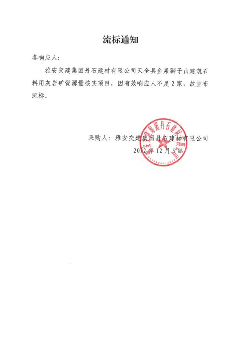 雅安交建集團(tuán)丹石建材有限公司天全縣魚泉獅子山建筑石料用灰?guī)r礦資源量核實項目流標(biāo)通知
