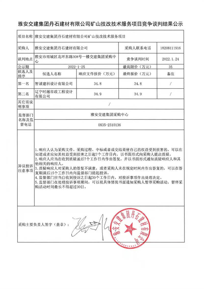 雅安交建集團丹石建材有限公司礦山技改技術(shù)服務(wù)項目競爭談判結(jié)果公示