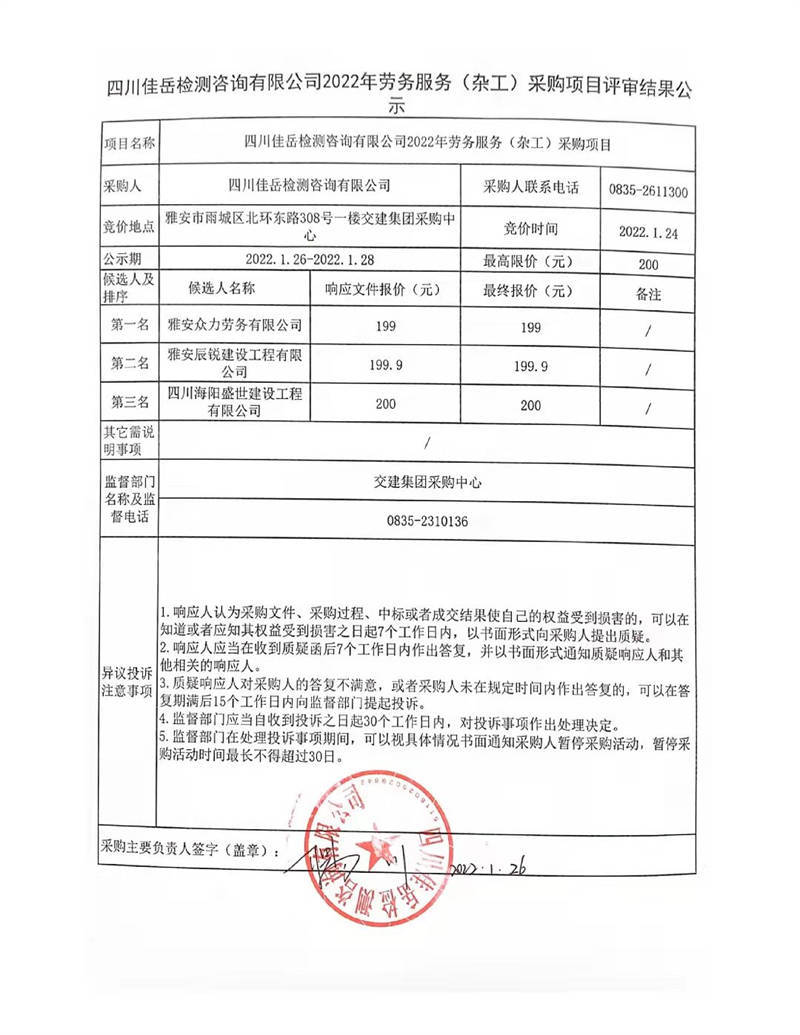 四川佳岳檢測(cè)咨詢有限公司2022年勞務(wù)服務(wù)(雜工)采購項(xiàng)目評(píng)審結(jié)果公示