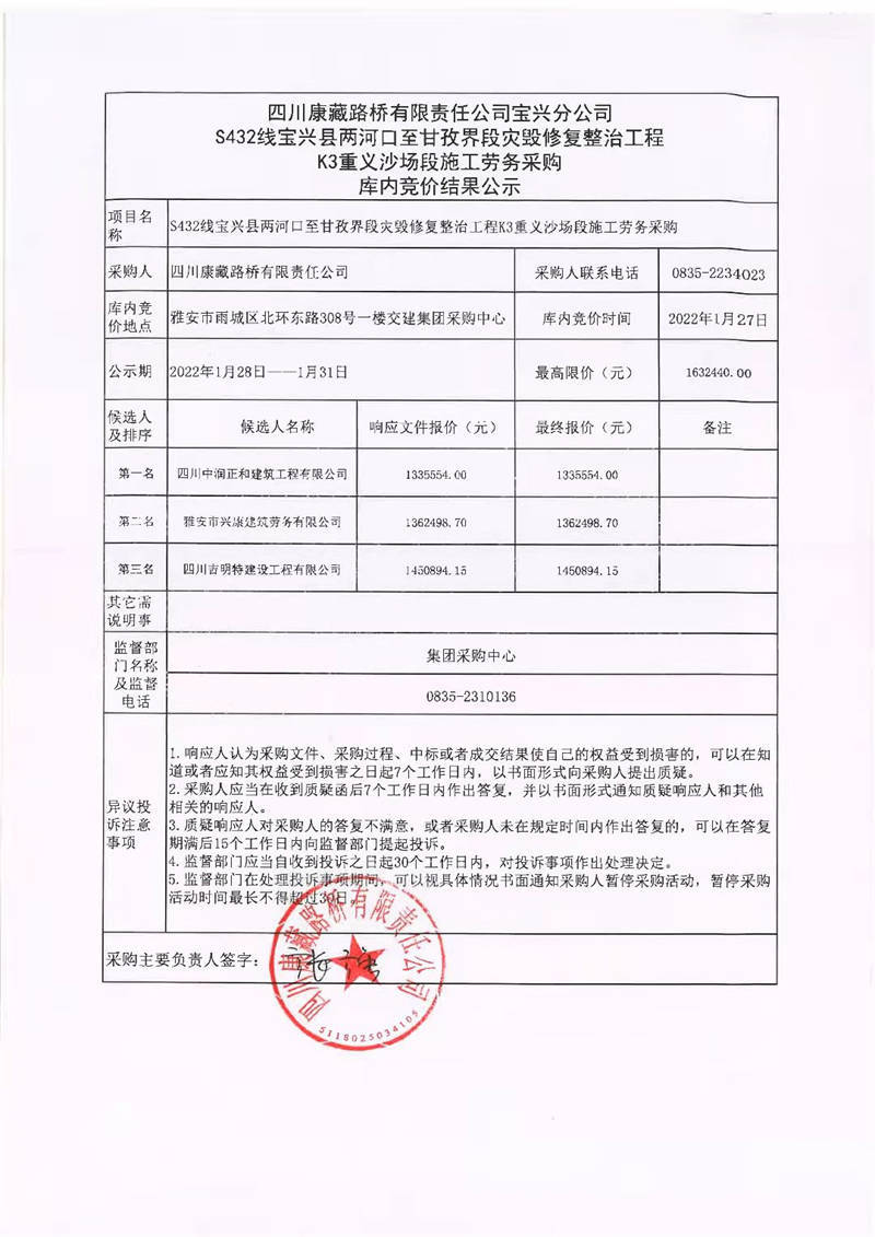 四川康藏路橋有限責(zé)任公司寶興分公司S432線寶興縣兩河口至甘孜界段災(zāi)毀修復(fù)整治工程K3重義沙場(chǎng)段施工勞務(wù)采購(gòu)庫(kù)內(nèi)競(jìng)價(jià)結(jié)果公示