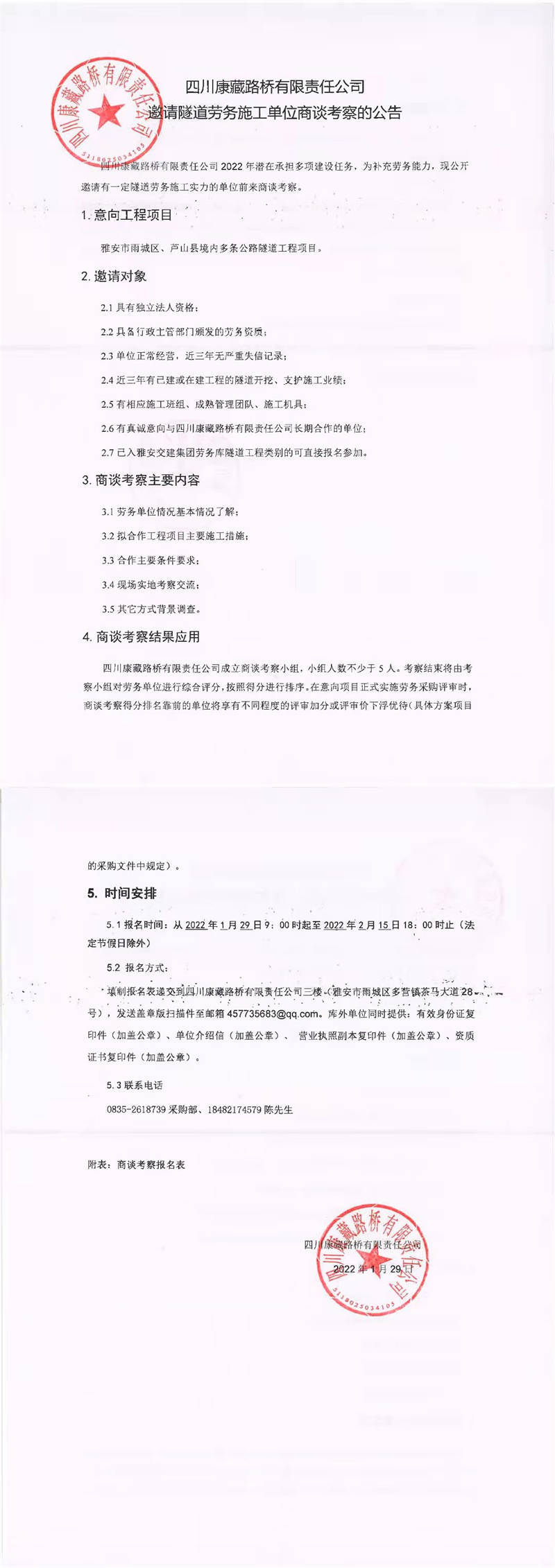 四川康藏路橋有限責(zé)任公司邀請(qǐng)隧道勞務(wù)施工單位商談考察的公告