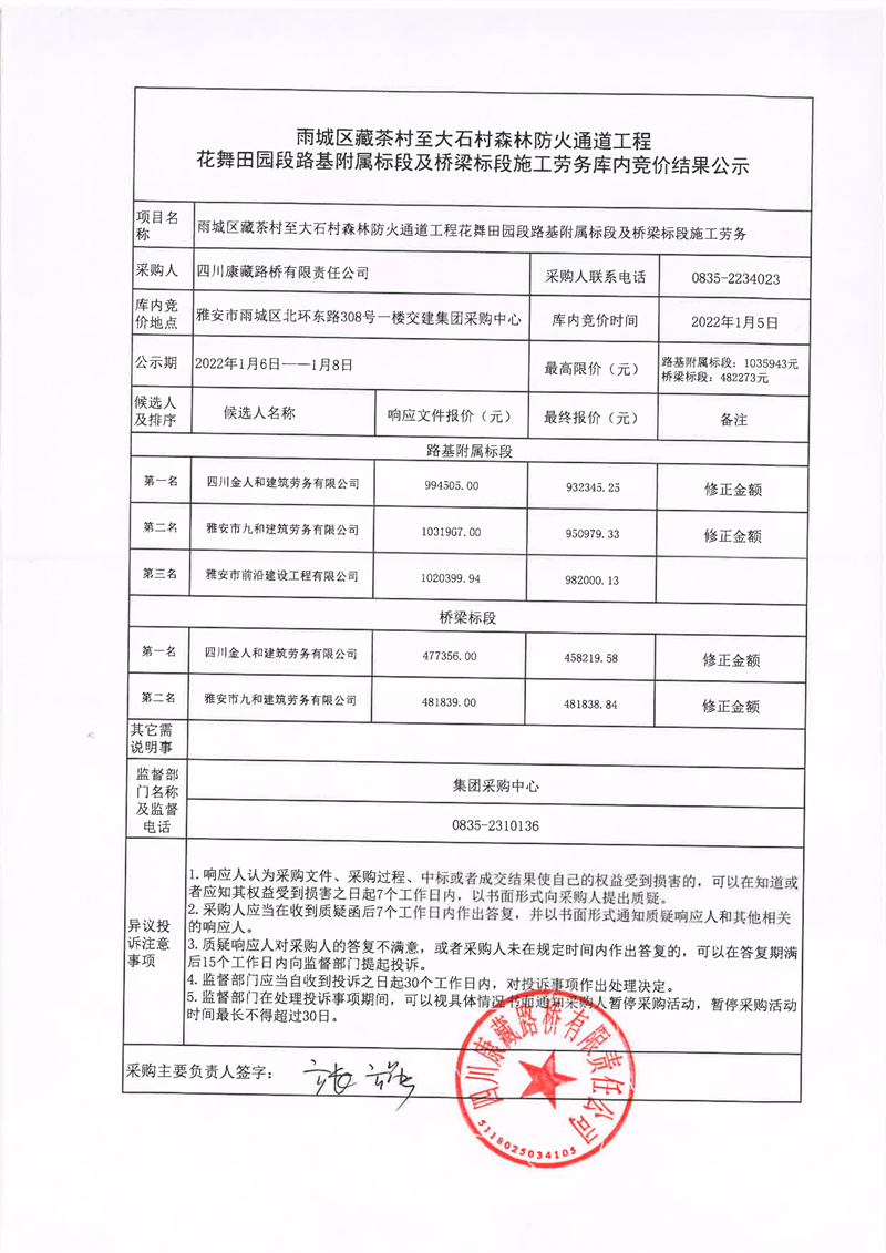 四川康藏路橋有限責(zé)任公司雨城雨城區(qū)藏茶村至大石村森林防火通道工程花舞田園段路基附屬標(biāo)段及橋梁標(biāo)段施工勞務(wù)庫內(nèi)競(jìng)價(jià)結(jié)果公示