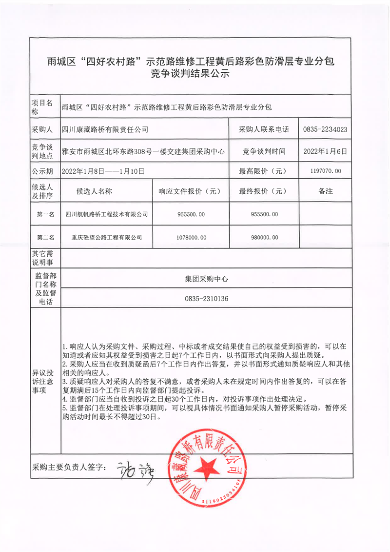 四川康藏路橋有限責(zé)任公司雨城區(qū)“四好農(nóng)村路”示范路維修工程黃后路彩色防滑層專業(yè)分包競爭談判結(jié)果公示