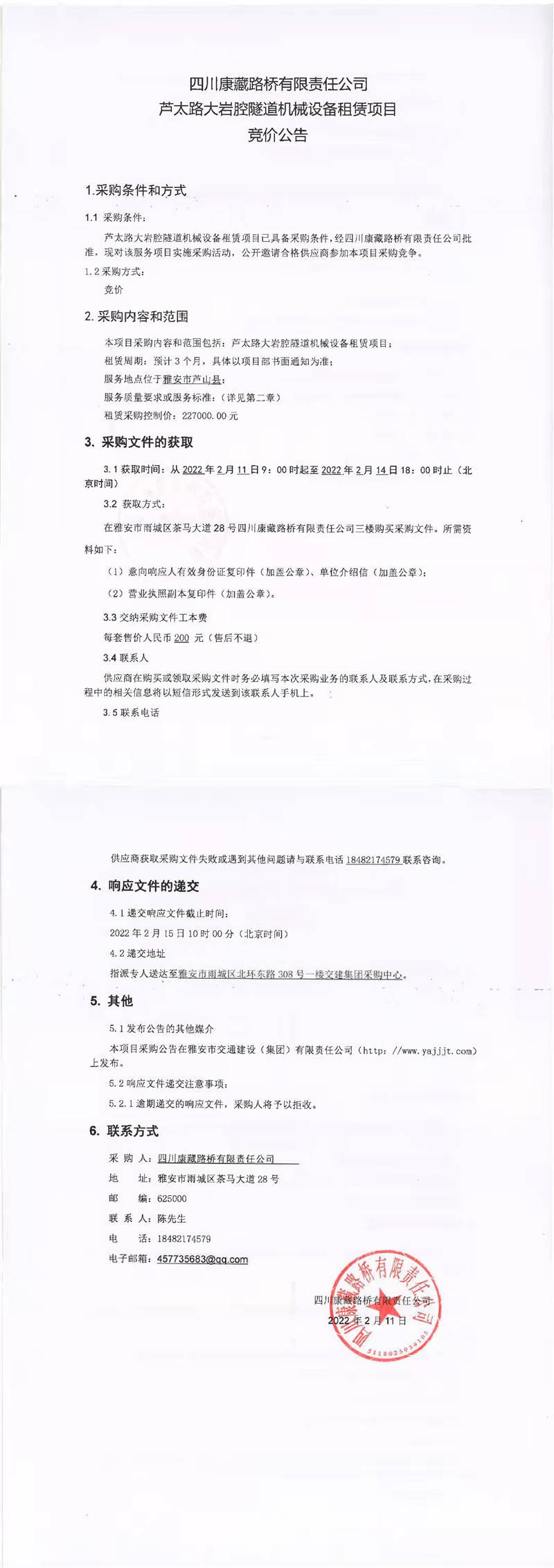 四川康藏路橋有限責(zé)任公司蘆太路大巖腔隧道機械設(shè)備租賃項目競價公告