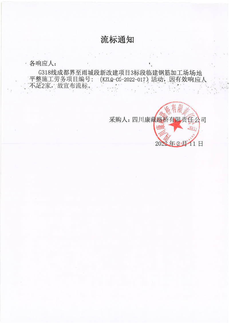 四川康藏路橋有限責任公司G318線成都界至雨城段新改建項目3標段臨建鋼筋加工場場地平整施工勞務項目流標通知