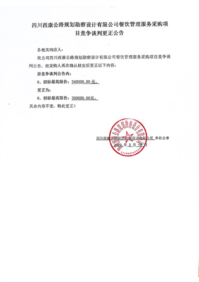 四川西康公路規(guī)劃勘察設(shè)計有限公司餐飲管理服務(wù)采購項(xiàng)目競爭談判更正公告(第二次)