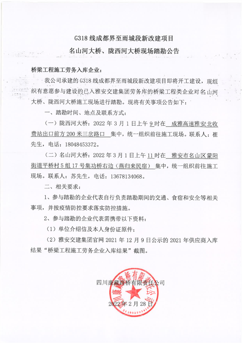四川康藏路橋有限責(zé)任公司G318線成都界至雨城段新改建項目名山河大橋、隴西河大橋現(xiàn)場踏勘公告