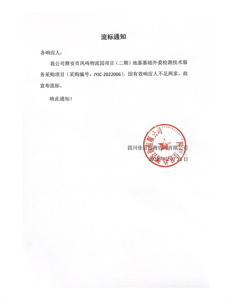 四川佳岳檢測(cè)咨詢(xún)有限公司雅安市鳳鳴物流園項(xiàng)目(二期)地基基礎(chǔ)外委檢測(cè)技術(shù)服務(wù)采購(gòu)項(xiàng)目流標(biāo)通知
