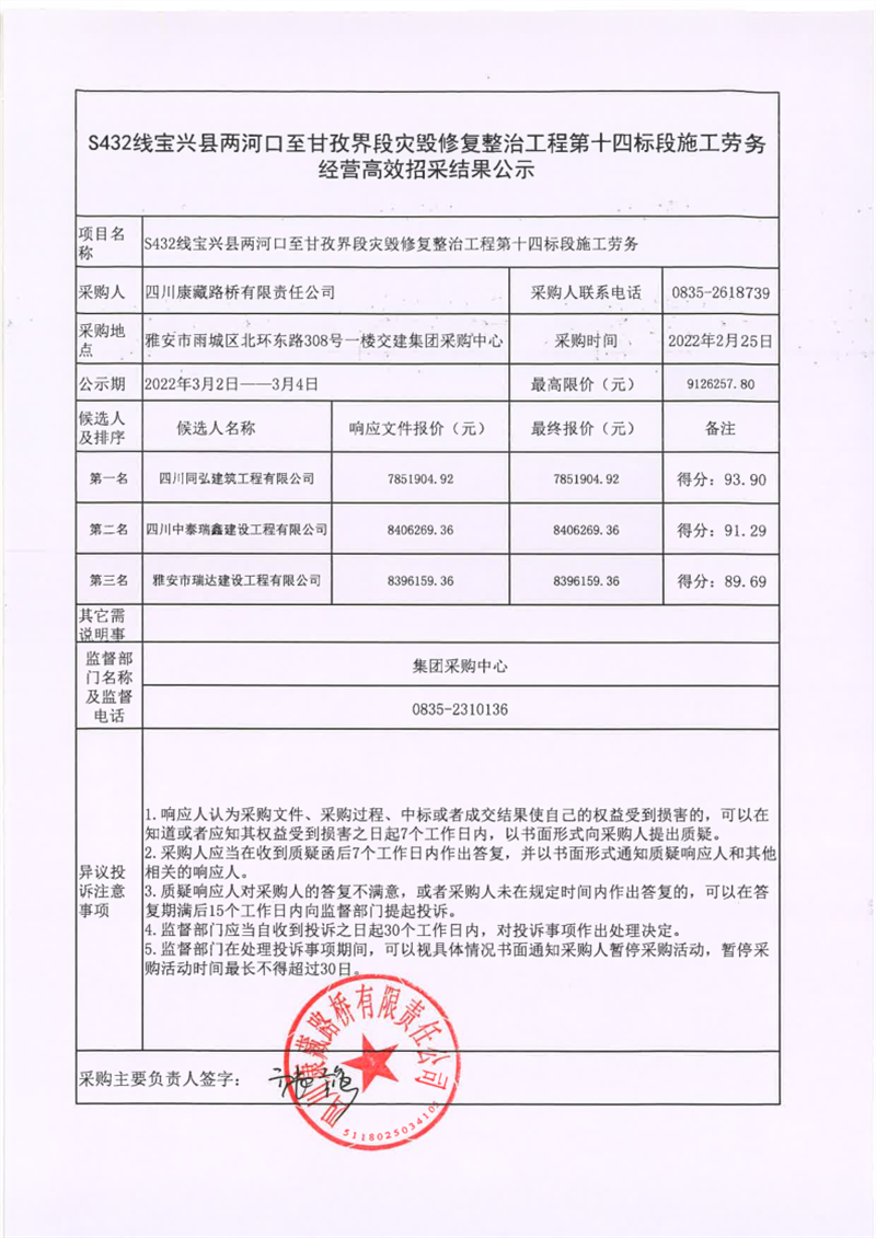 四川康藏路橋有限責(zé)任公司S432線寶興縣兩河口至甘孜界段災(zāi)毀修復(fù)整治工程第十四標(biāo)段施工勞務(wù)經(jīng)營(yíng)高效招采結(jié)果公示