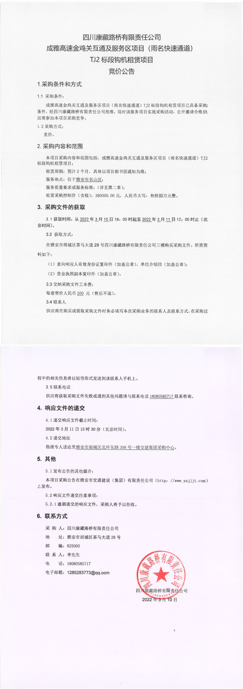 四川康藏路橋有限責(zé)任公司成雅高速金雞關(guān)互通及服務(wù)區(qū)項(xiàng)目(雨名快速通道)TJ2標(biāo)段鉤機(jī)租賃項(xiàng)目競價(jià)公告