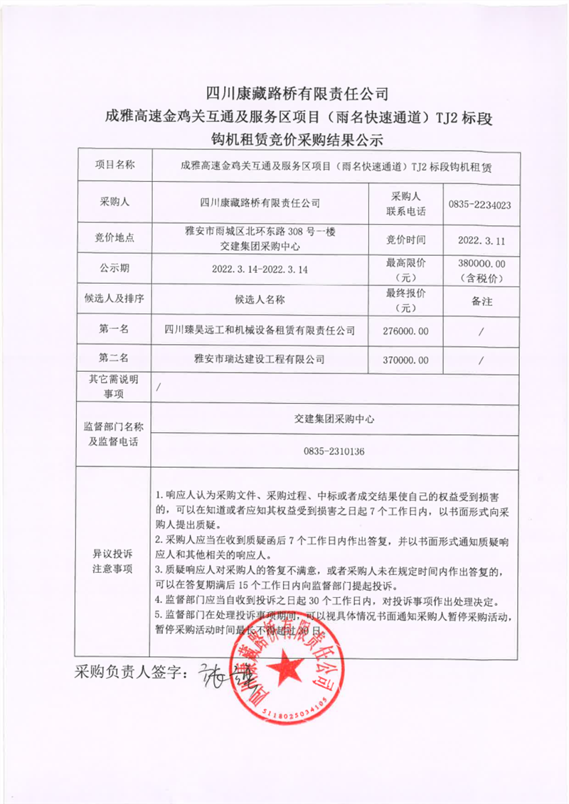 四川康藏路橋有限責(zé)任公司成雅高速金雞關(guān)互通及服務(wù)區(qū)項目(雨名快速通道)TJ2標(biāo)段鉤機(jī)租賃競價采購結(jié)果公示